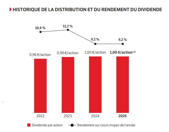 Le Conseil d’administration de la Société propose à l’Assemblée générale du 23 avril 2026 le versement d’un dividende de 1,00 €/action au titre de 2025, soit 80 % du Résultat net récurrent (RNR) de l’exercice, offrant un rendement de 5,5% sur l’actif net réévalué NTA de 16,96 euros par action à fin 2025 et de 9,1 % sur le cours de clôture annuel 2025.