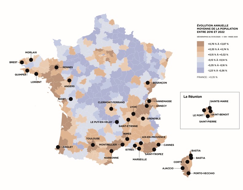 2 _ Une implantation dans des zones géographiques maitresses articulées autour de métropoles dynamiques présentant des évolutions démographiques et économiques, notamment de revenus, supérieures à la moyenne nationale ;